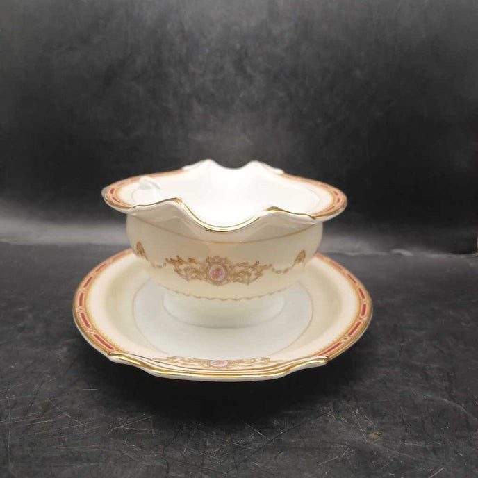 Noritake "Cameo" Red and Gold Pattern - Gravy Boat With Attached Underplate, Gravy Server, Gravy Pitcher, Sauce Boat